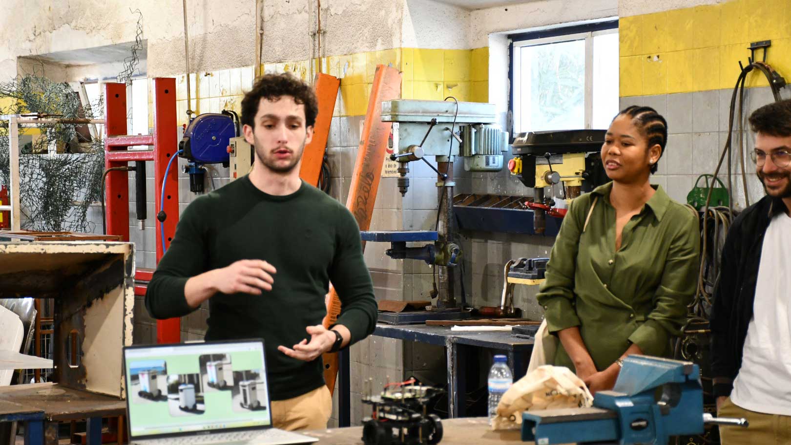Durante o dia discutiram-se ideias e foram partilhados vários projetos com os formandos e técnicos. Nas visitas realizadas às oficinas de formação os empreendedores apresentaram os seus projetos. Por exemplo, com os formandos do curso de Reparação de Carroçarias de Automóveis Ligeiros foi discutido um caixote de lixo inteligente robótico criado com materiais reaproveitados (metal); no curso de Cozinheiro, o grupo empreendedor apresentou uma APP de aproveitamento, seleção e recolha de resíduos alimentares.